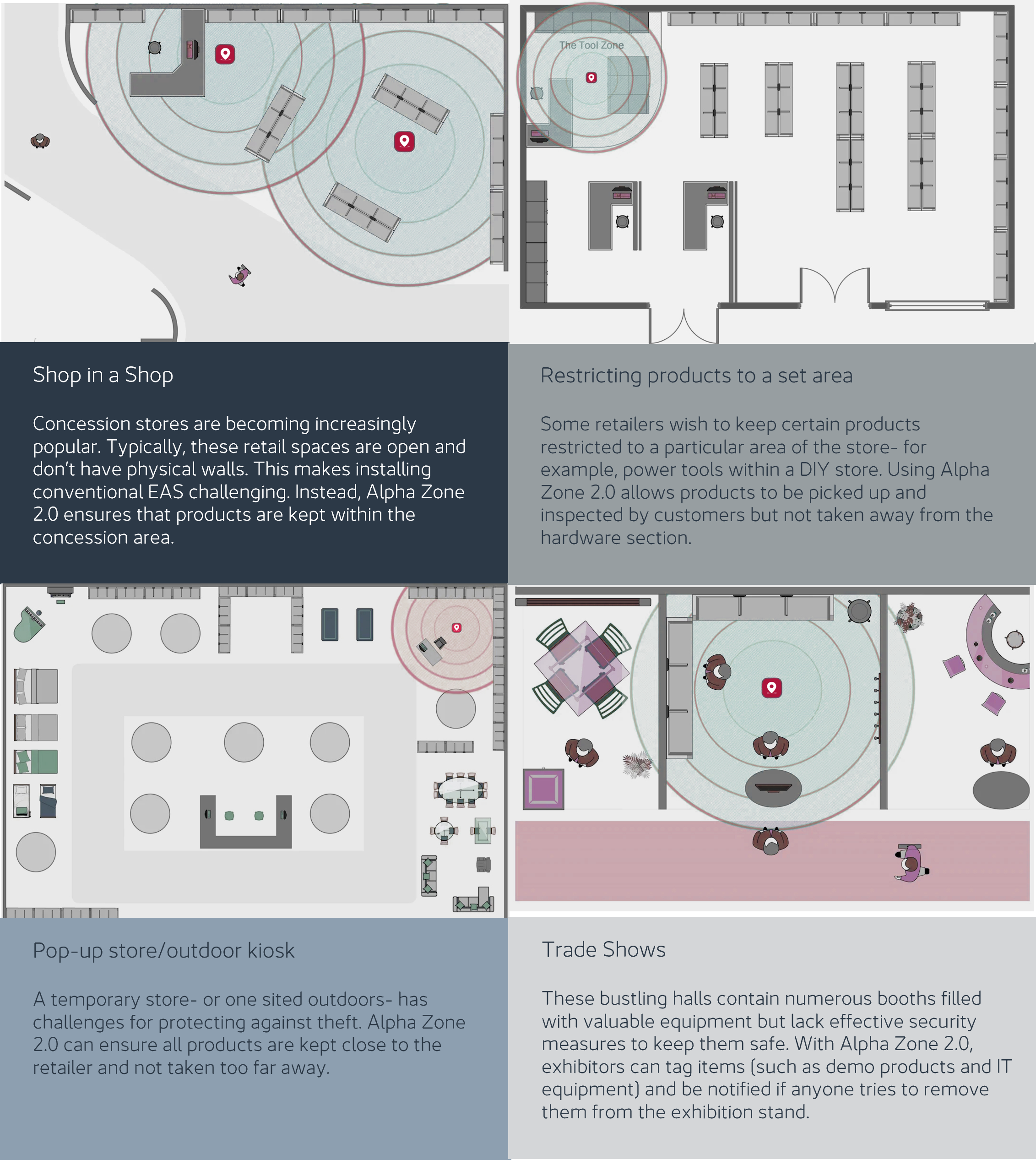 Alpha Zone 2.0 is a next generation anti-theft product locationing solution. The solution offers zonal protection of display or high value merchandise without restricting the shopping experience and reducing the store’s risk of theft.