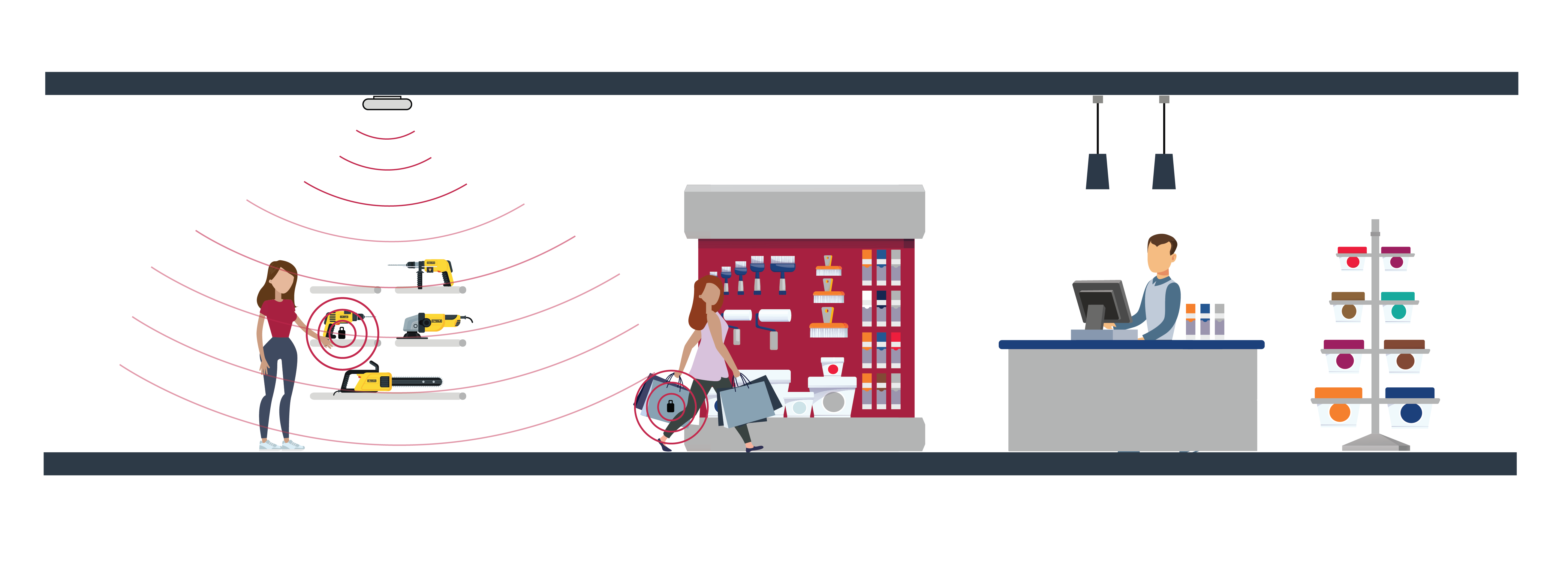 A protected area in the store has a Hub antenna mounted above the area, and products are fitted with either surface tags or cable lock devices. Once a protected product moves out of the display area, the tag will alarm via a built-in audio sounder. If the protected product is taken back into the area, the tag will stop alarming automatically.